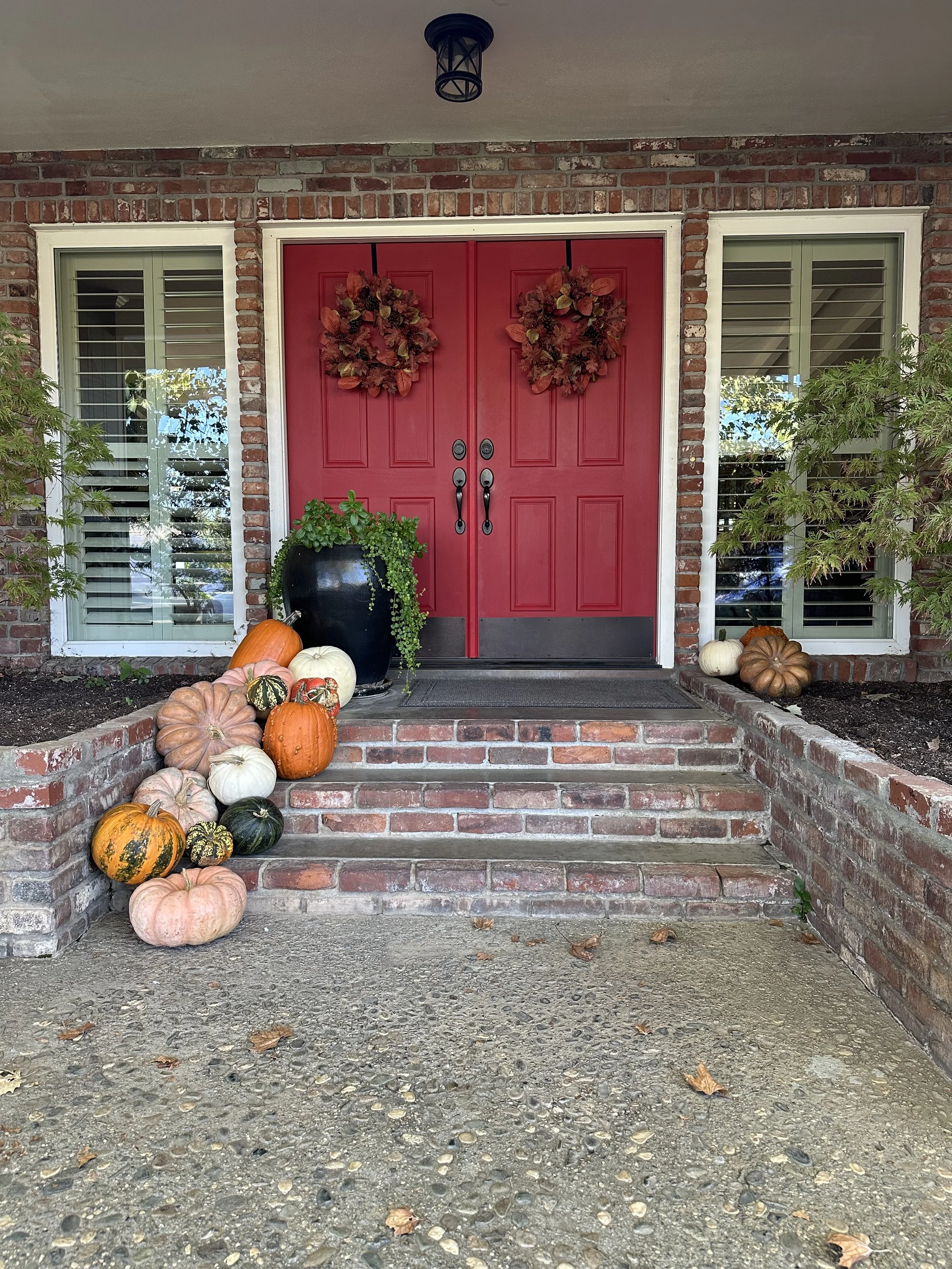 Front entrance with red double doors decorated with fall wreaths, surrounded by pumpkins and gourds on brick steps, with two windows with white shutters flanking the door, and a black porch light overhead.